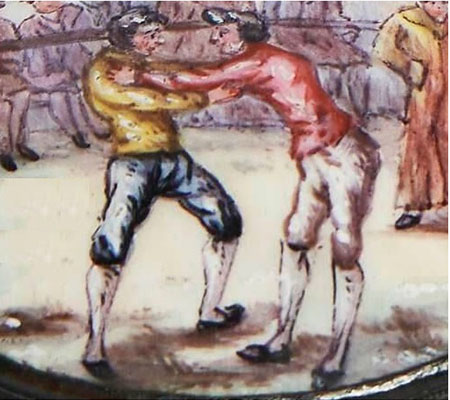 Interestingly, a similar wrestling “at arms length” game was very popular in Colonial America where it was known under different names, such as square-hold or box-wrestling and etc. In America this traditional manly pastime was preserved in its original wrestling match format, and never deteriorated into a pure shin-kicking fight.