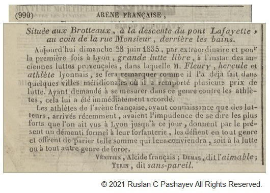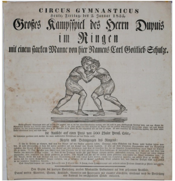 The “Rules of Wrestling” compiled by a famous French wrestling pioneer called Jean Dupuis appeared in the programme of “Circus Gymnastics” which advertised his wrestling match against a German strongman named Carl Gottlieb Schulze. That match was supposed to happen on January 2nd, 1835. The wrestling style of that contest could be simply referred to as a “Standing Greco-roman”. According to the aforementioned rules (Articles 1 and 2) the fall on both shoulders did count only in case of such throw being given from the standing position, and if it didn’t happen that particular way then the wrestler(s) had to get up and renew their contest, so to speak wrestling on the ground wasn’t allowed. “1) In order to receive an award, the wrestler has to throw his opponent onto his back. The one whose (both) shoulders didn’t touch the ground as a result of such a throw is not considered defeated; he is allowed to get up (from the floor) and start the wrestle all over again. 2) The man who is thrown on both shoulders must leave the arena.” Wrestling was allowed only above the waist,and with “flat hands”, the use of legs and feet for throwing was expressly forbidden by the rules, any unfair action was strictly prohibited. If the victory wasn’t decided in 15 mins the match was called a draw. I want to express my special thanks to my friend, a wrestling historian Mr. Michael Murphy (USA) for sharing this unique historical document with me.