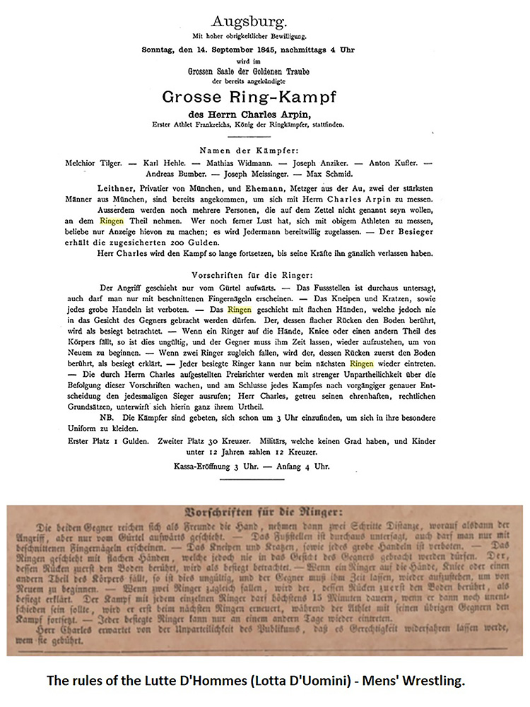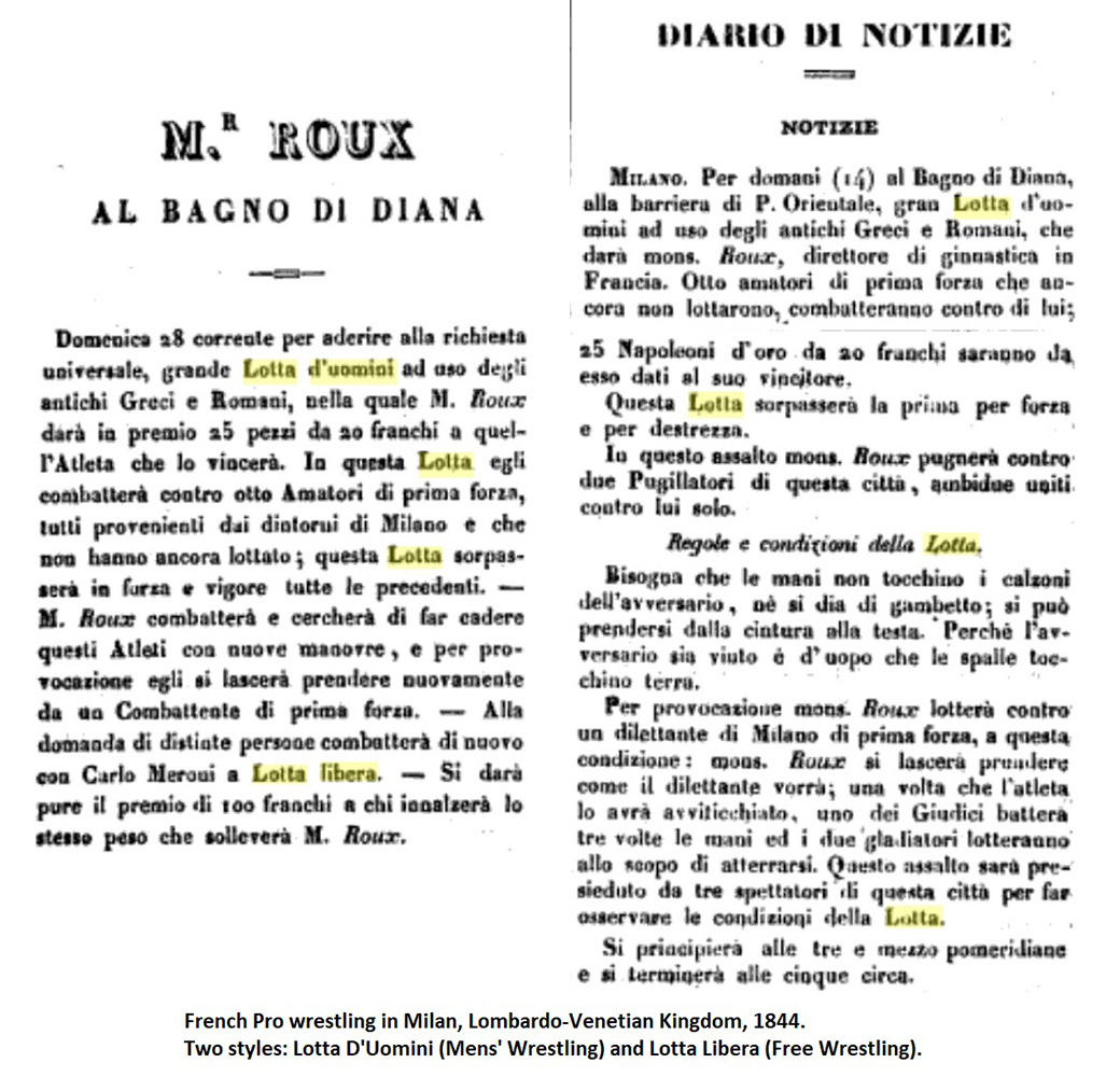 Interestingly, even before the French (Greco-Roman) style was popularized all around the world it was both traditional Provencal wrestling styles, the Men’s Wrestling and the Free Wrestling that were first exported abroad by the wrestling pioneers from Midi, France. Among such pioneers were popular French wrestlers, Mr. Roux who promoted his sport in the city of Milan (Lombardo-Venetian Kingdom), and King of Wrestlers Mr. Charles Arpin who was very active in Germany and in the United States.