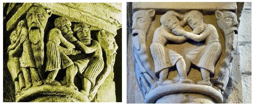 The great visualizations of those two modes of wrestling are present in the form of Romanesque sculptures at Burgundian churches, such as Church of Our Lady of the Assumption at Anzy-le-Duc (9th-12th centuries) and in the Church of St Peter at Saint-Pierre-le-Moûtier (12th-13th centuries) along with a tug-of-war variation involving the wooden stick.