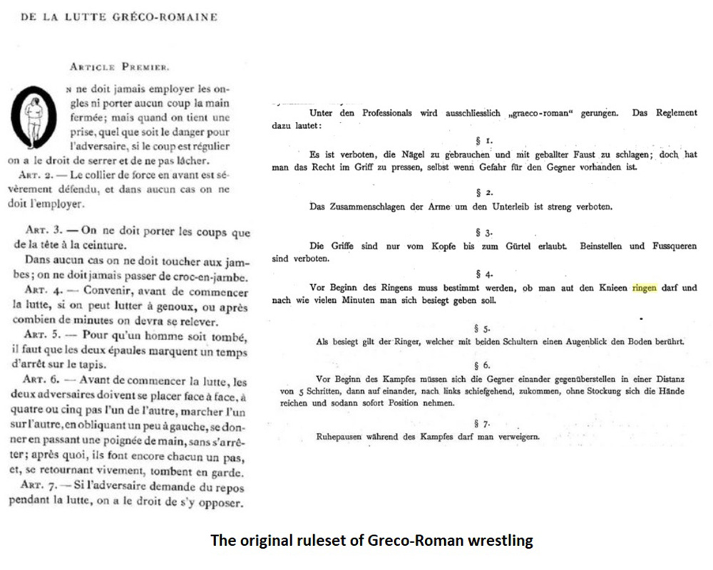After the years of research I was lucky to finally find the unique rules of Lutte D’Hommes (Men’s Wrestling). It was a German translation of the original Provencal ruleset. Basically it was a standing Greco-Roman wrestling in which only attack above the waist is legit, and wrestling on the ground or attack on the person who was down was explicitly prohibited:
