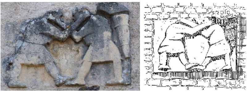 One of the most famous portraits of the two men having a wrestling match which started with an equal “head-hold” is a bas-relief from the 12th century Church of St. Blaise of La Celle, Cher (France) by an artist called Froto Ardus. According to the famous French historian Alphonse Buhot de Kersers (1835-1897) this sculpture shows a strong resemblance with the best samples of Frankish Carolingian Art.