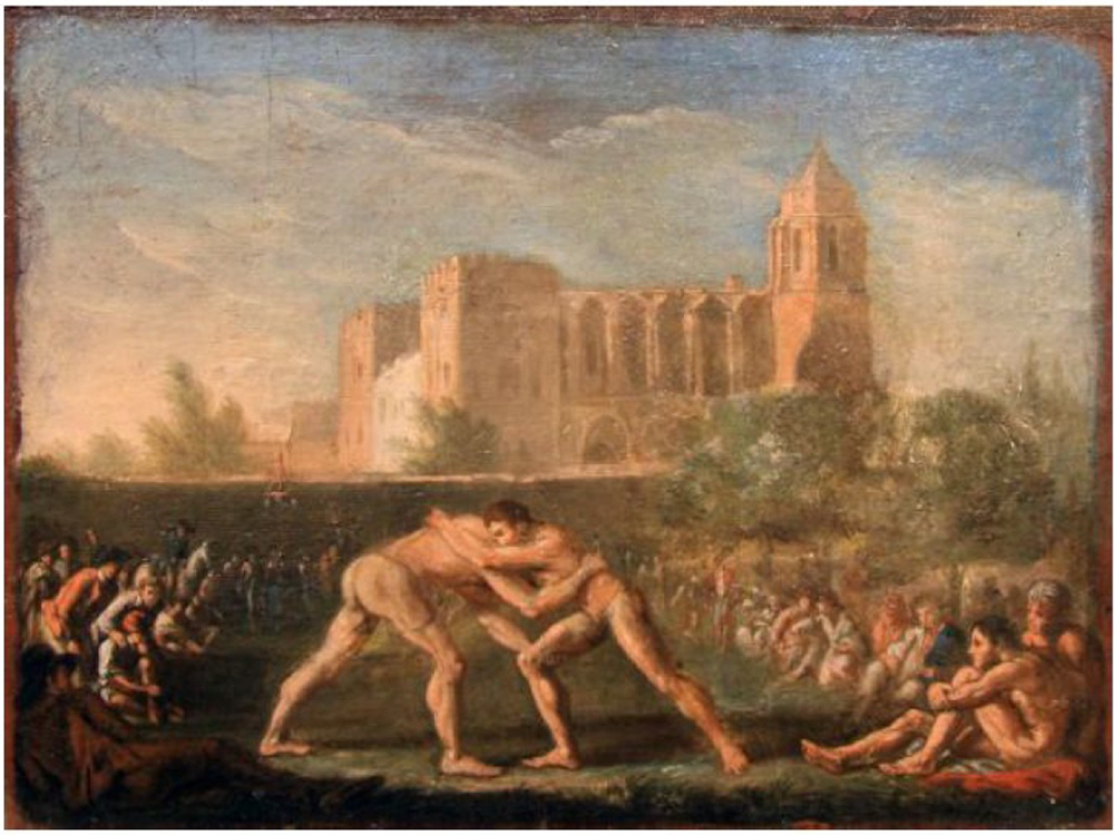 The rules which governed that contest were specified as such: to win a match the wrestler had to throw his opponent flat onto his back (shoulders were not mentioned in that reference at all) and keep him in that supine position for a few seconds by placing his knee on his chest in the sign of victory. Basically, the winner retains his feet after the throw, and is in full control of his opponent. It is clear from the text that wrestlers would try to avoid wrestling on the ground, though it appears that it wasn’t prohibited by the rules which stated that if both wrestlers fell together they can decide to continue their fight on the ground if they will, but as it was objectively noticed that often in that case it was not the one who performed the takedown wins, but the most agile wrestler does.