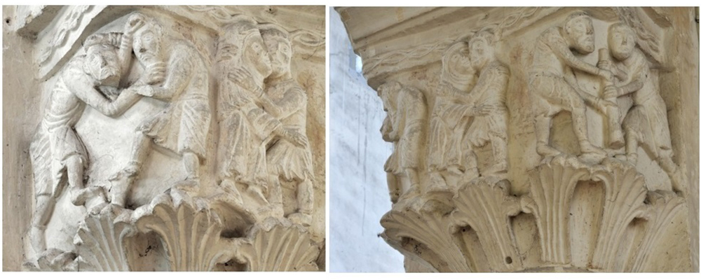 A 12-13th century corbel Romanesque sculpture from the Grande-Sauve Abbey in the village of La Sauve, Gironde (France) shows typical motive of two men in beard-holds (an “extreme” variation of the head-holds) continuing their struggle on the ground.
