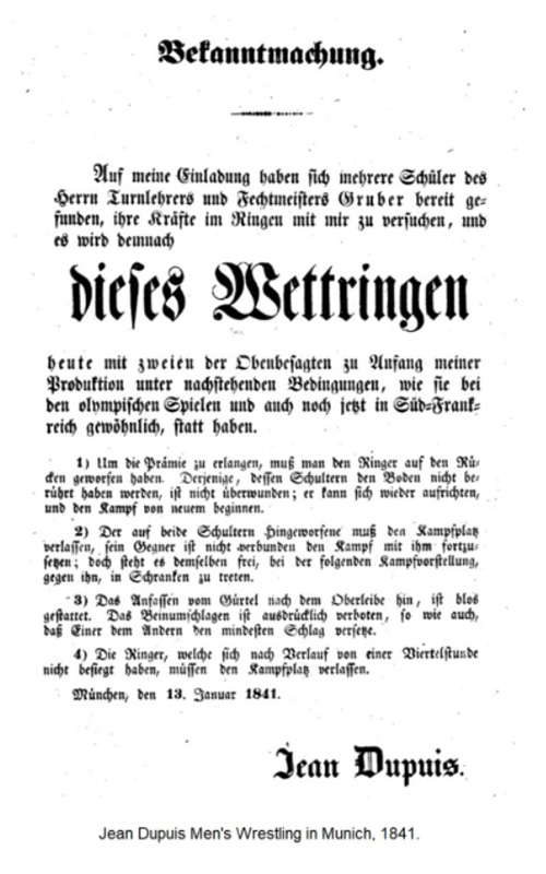 I have previously mentioned Jean Dupuis, he truly was an iconic pro wrestling character, the true pioneer of the sport, I used a depiction of two wrestlers from his personal seal as the cover image for this article. Dupuis popularized French wrestling all around the Continental Europe, it was him who first brought French professional wrestling to Germany in the 1830s, and he successfully continued running his Men’s Wrestling matches in Munich, Germany in 1841. These are the rules he used in his wrestling matches: