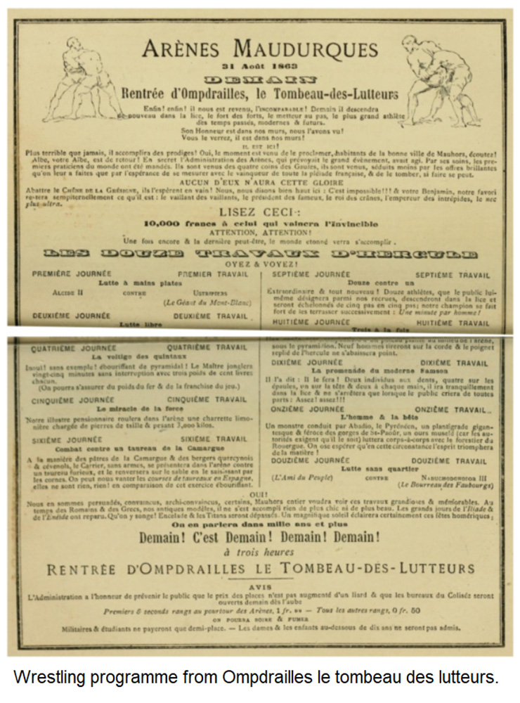 A very informative passage on Lutte D’Hommes wrestling tournament is presented in the Lettres sur Nismes et le Midi (Vol 1), 1840, by J.F.A. Perrot.