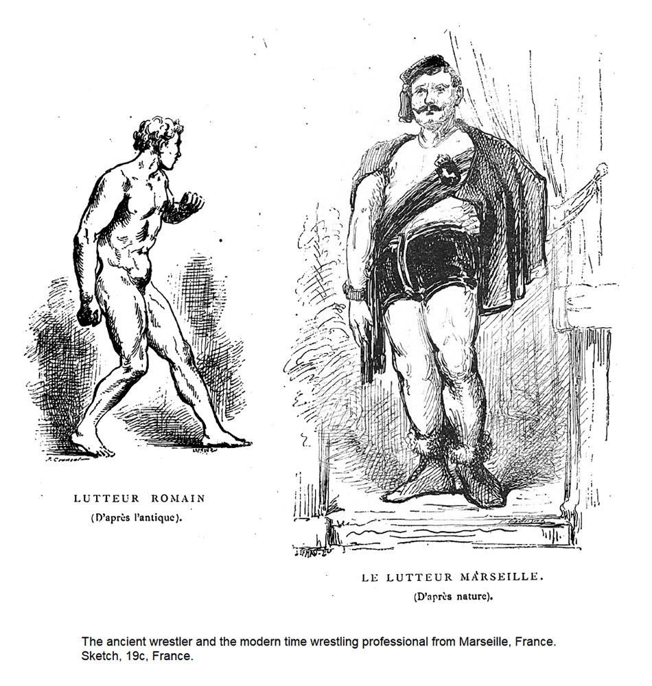 The French writer called Désiré Nisard (1806-1888) referred to the style of wrestling which was practiced in Nimes as the “ancient Greek wrestling” or “lutte à la manière antique, entre deux adversaires armés du gantelet, ou tout luisants d'huile.”