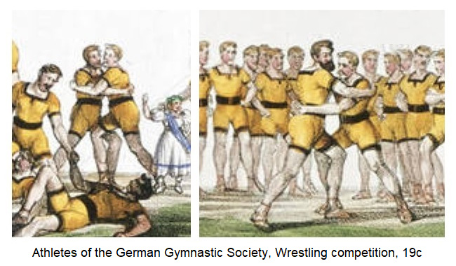 Interestingly, in the 19c Lyfvat wrestling was revived by the German Gymnastic Society (GGS) and became an official wrestling style for both, the amateur and professional athletes, the members of Turvereins (Turner gyms) in Germany, Netherlands, and Belgium, and even in the United States. Their, the GGS, a safer version of Lyfvat, allowed only holds from the person’s hips to their shoulders (including of course the holds by the arms), and avoiding all kinds of neck-holds, which historically, as we know, were allowed; tripping just like it was in the olden days was also strictly prohibited. In amateur contests it was enough to throw your opponent on his back (either lying or sitting positions “back falls” counted) and in professional matches it was required to throw adversary from standing position right onto both his shoulders according to the old Lyonnaise tradition.