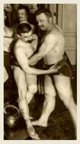 The Old Ringen wrestling has evolved from a primitive trial of strength called Gürtelringen (belt wrestling). This vintage all-Germanic style was an equal fixed hold standing wrestling. The “right hand over and left hand under” holds were taken of two handles attached to the thick leathern belts buckled about the waist, and which were prevented by straps from shifting. No use of legs or feet for throwing was allowed during the matches. The objective of the match was to throw opponent flat on his back (two shoulders touching ground simultaneously) with or without attacker falling himself. The matches were played 2 out of 3 falls. The main techniques of that style were: lifting adversary off his feet and taking him down or throwing him over the head, or pulling him towards yourself and overturn him backwards, or simply swaying opponent from side to side and trying to unbalance him thus causing a fall. The weight of wrestler and his physical strength were decisive factors for winning those contests. In the second half of XIX century this style was popularized all around Eastern Europe and was known as the Swiss belt wrestling. Among the prominent practitioners of Gürtelringen was Emil Voss of Stettin, Pomerania (now Szczecin, Poland). In the 1880s this style was brought to Russia and taught as the “Russo-Swiss Wrestling” at the St. Petersburg’s Athletic and Cycling Club of Dr. Wladislaw Krajewski. The professional Gürtelringen matches were regularly performed in circuses as a part of the wrestling entertainment. All the best Russian Graeco-Roman wrestlers had Gürtelringen background.
