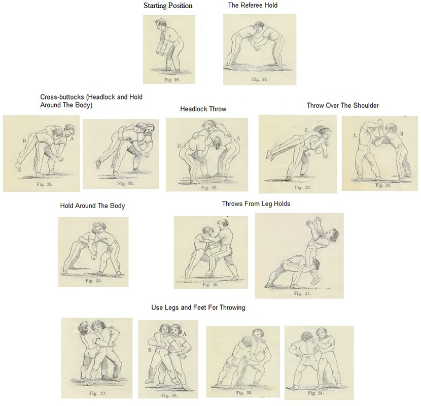 According to the Rules of German freestyle wrestling as they appeared in the 1793 book by J. GutsMuths called “Gymnastics for Youth” there were two kinds of Ringen, the Complete Wrestle and the Repeated Wrestle. In the style called Complete Wrestle, the competitors stood a few steps apart from each other and after a signal the wrestling match would begin with a mere play with the hands in order to obtain the most advantageous hold. This was done to prevent wrestlers from rushing on each other with too much violence. The wrestlers were allowed to seize each other fairly round the body or by the limbs (above and under the waist), the head and neck were to be spared as much as possible, and blows of any kind were strictly prohibited. According to the old German tradition one was considered defeated when he is thrown down flat on his back and kept from rising in that immovable position for the previously agreed amount of time so he cannot gain the uppermost position (pinning fall), or until he himself verbally admits his defeat and gives in any resistance (cries, enough!) Those matches were one fall affairs. In the style called Repeated Wrestle the victory was gained by giving the adversary two back falls, and it wasn’t necessary to keep him on the ground, the thrower quits his opponent the moment he is down on his back (quick flying fall). The wrestler who has thrown his opponent without falling himself or touching the ground with his hand or knee was an immediate victor. In that style generally the wrestler was considered defeated if after being thrown he landed on his back, but sometimes it was enough if any part of the trunk of his body (back, belly, sides) touches the ground. Those matches were contested usually for 2 of 3 and sometimes for 3 of 5 back falls.