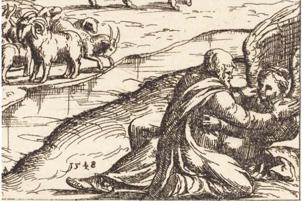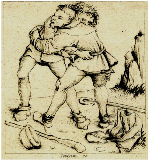 A variation of the most popular Medieval European wrestling theme “Jacob wrestling with the Angel”, the 1548 engraving by the German artist called Augustin Hirschvogel (1503-1553) of Nuremberg (Franconia, Germany) shows two antagonists grappling on the ground for the victory after the “Germanic Fashion”, i.e. trying to achieve a dominant mount position and restrain movements of the opponent who is held underneath flat upon his back; in German this kind of “pinning” opponent was called “Festhalten”. Not only this visualization of the famous Biblical wrestling contest perfectly matches the Monti’s description of the Germanic wrestling traditions, but it also significantly differs from all other contemporary depictions of the same theme made everywhere else in Western Europe and in Britain on which the two rivals are always shown facing each other in a standing upright wrestling combat.