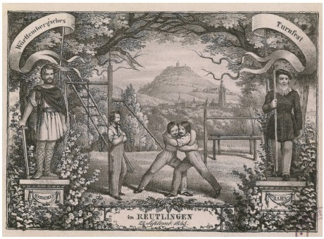 During the 1800s, the Turnvereins Era, the Medieval German Ringen was revived by the German Gymnastic Society (GGS) which popularized it all around the world. The GGS style of Ringen was first introduced by the forefathers of modern gymnastics, German enthusiasts Johann Christoph Friedrich GutsMuths (1759-1839) and Dr. Friedrich Ludwig Jahn (1778-1852). The former was author of the famous “Gymnastics for Youth” (1793) and the latter was founder of gymnasia in Berlin (1811) and organizer of large gymnastic gatherings.