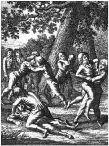To settle quarrels, besides actual wrestling, Medieval Germans used rough and tumble up and down fighting called Raufen (Scuffling). All kinds of wrestling holds (including illegal holds) as well as punching and kicking were allowed in Raufen. The Raufen combat was an exhibition of animalistic brutality and featured atrocities like biting, gouging and etc. The use of various small weapons in this kind of fight was permitted and negotiated prior to the contest. Notably, the proficiency in the art of wrestling was a key factor in winning any fight. In fact Raufen was a degenerated form of Ringen. Sometimes Raufen matches attracted local gamblers and were of “professional challenge” nature since the considerable sums were at stake. Thus Raufen became illegal and since then was practiced by the low order (local ruffians).