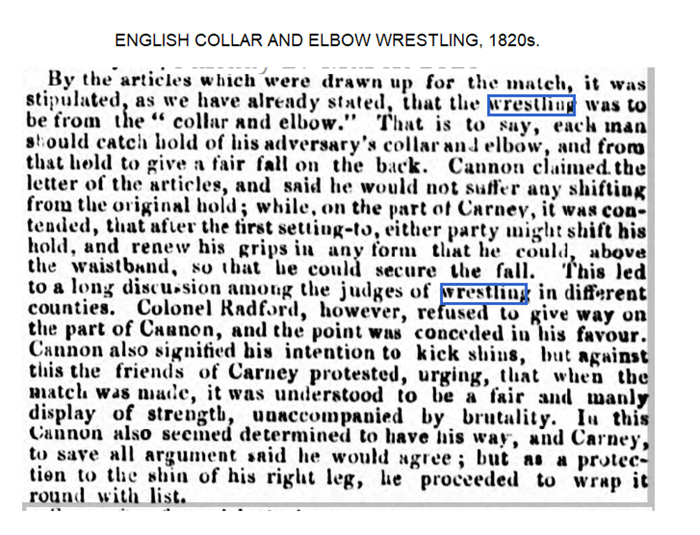 It does look like often time a fair fall on the back was substituted with e flat fall on either back, side or belly, this system was adopted in Norfolk in the early 1800s and promoted by the local wrestler called Charles Layton. In Lincoln they didn’t adopt new rules and still continued practicing the fair back fall tradition. A good example of that old English fixed hold collar and elbow wrestling is a famous 1825 match between Cannon and Carney.