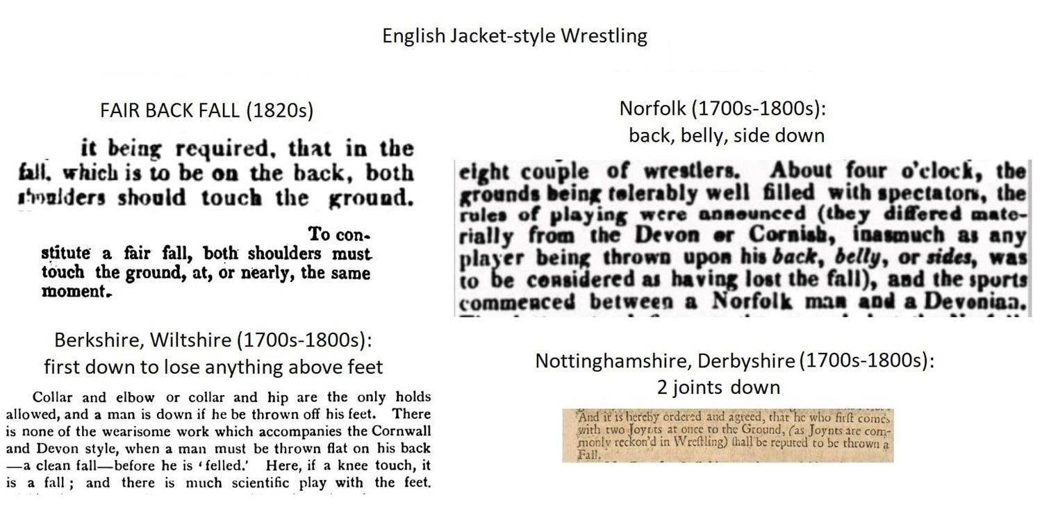 In Berkshire, the county which historically was considered the hotbed of traditional English collar wrestling in the 1700s they got rid of the fair back falls substituting them with a simple rule of “three go downs”.