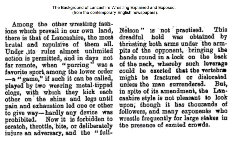 “Ground wrestling, however, which means, if it means anything, simply a kind of dog-fight on the ground, is utterly opposed to our notions of sport, and can never find favour in this country ; indeed, Lancashire is the only county in England where it is practiced.”