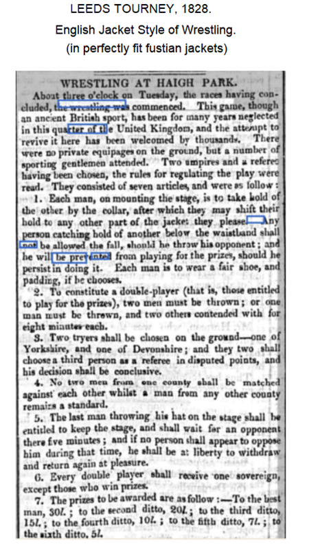 The year 1828 was a very important year for English prize wrestling. On Easter holiday the gentry of the City of Leeds, in the neighboring with Lancs, the West Riding of Yorkshire, held an open to all wrestling championship tourney. It was a tourney in traditional English jacket-style of wrestling, in which only holds of the jackets being allowed, often this style was referred to as a “one hand to collar” wrestling. The rules stated: “is to take hold of the other by the collar, after which they may shift their hold to any other part of the jacket they please”. By the way the English wrestling jacket, unlike the Cornish jacket, was a tight, perfect fit short fustian jacket. Unfortunately the Cornish sportsmen ignored this tourney, I am surprised they decided not to participate in this big wrestling gathering but very likely they were against the “each man to wear a fair shoe and padding, if he chooses” thing. That condition was the main difference between Cornish and English jacket-wrestling styles, the Englishmen always wrestled in shoes. The Englishmen from various regions of the country did show up and participated. The competition was obviously dominated by the Devonian athletes, the best collar style wrestlers of England, and their hero A. Cann was an easy winner of the championship honors.