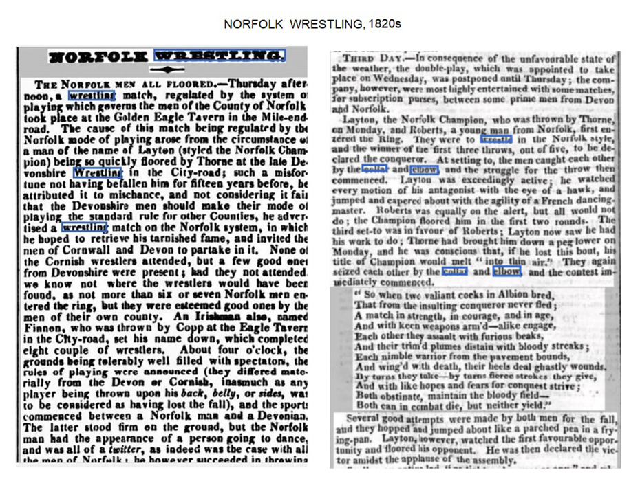 Below is an interesting reference to the Devon wrestling traditions from the early 1800s, and they suggested such “Norfolk” kind of falls in their competitions.